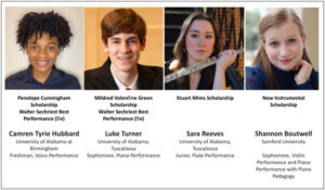 $1500 Piano Scholarship, Mildred Volentine Green Scholarship-Winner: Edward Forstman, University of Alabama at Birmingham Runner-up $1000: Brian Nabors, Samford University $1500 Voice Scholarship, Penelope Cunningham Scholarship-Winner: Devin Burton, University of Montevallo Runner-up $1000: Bryant Bush, University of Alabama at Tuscaloosa $1500 Instrumental Scholarship, Stuart Mims Scholarship-Winner: Catie White (flute), University of Alabama at Tuscaloosa Runner-up …